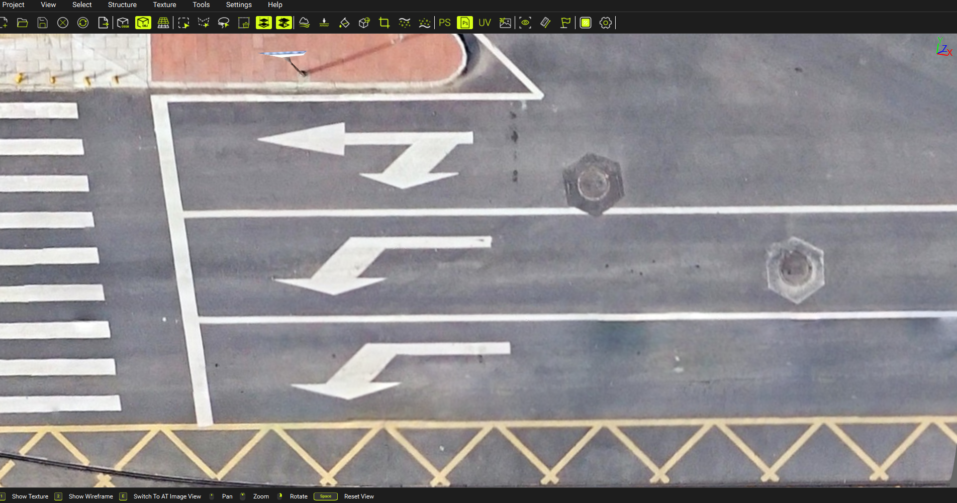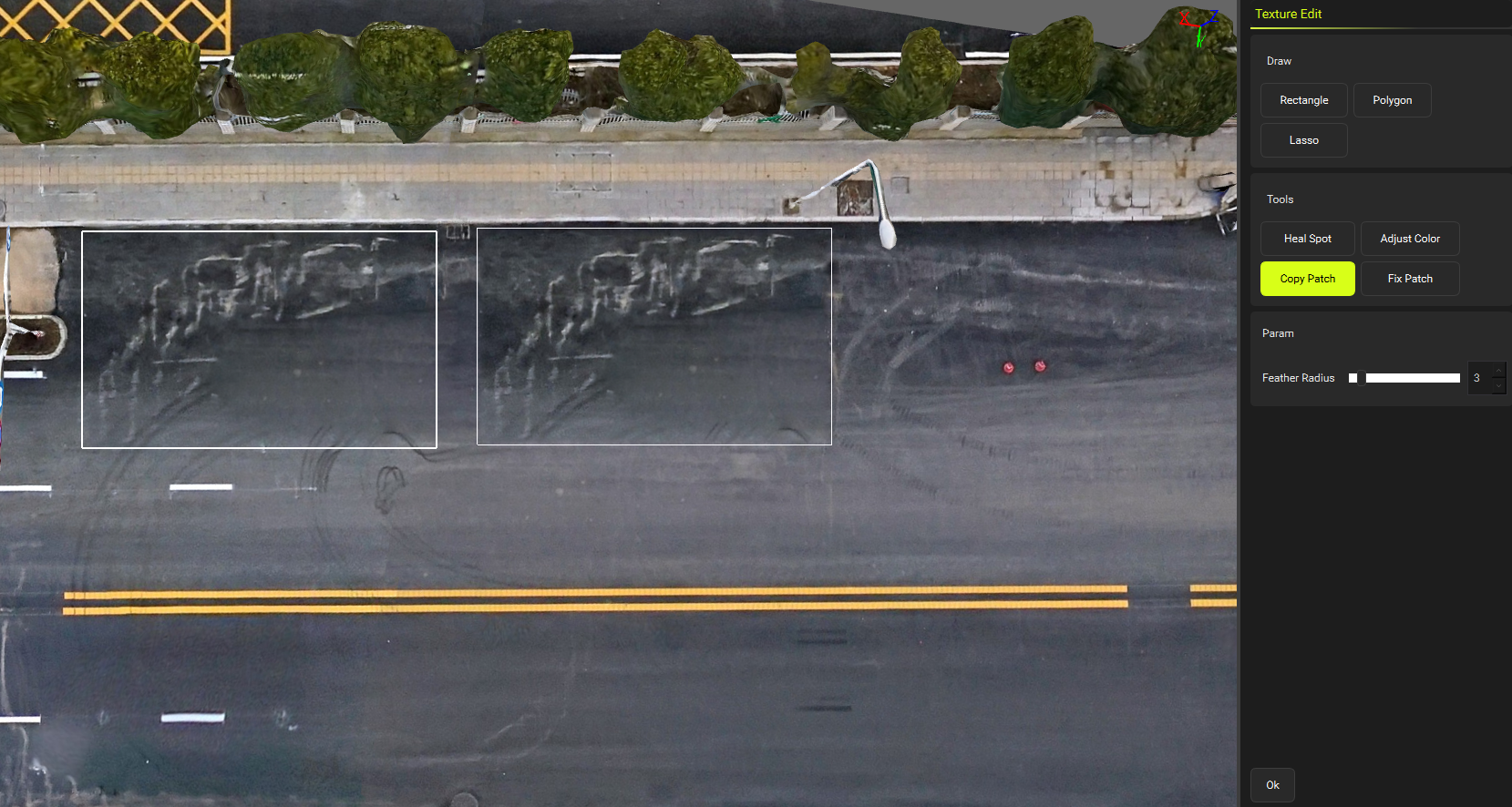 **1) Select Area** – In the OBJ view, draw a selection box around the area that needs editing. The software captures the texture of the selected area based on the current view.
